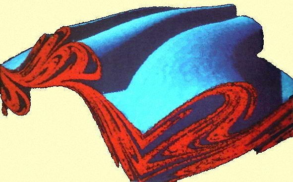 Der seltsame Attraktor des Pendels bei den Systemparametern = 0.052, a = 0.586, = 0.666. Der Blick ist schräg auf den Phasenraum gerichtet Die roten "Schnittflächen" sind Poincaré-Schnitte durch den Phasenraum bei = 0 (Schnittfläche vorne rechts), bzw. bei x = - (Schnittfläche vorne links). Vertikal ist die Winkelgeschwindigkeit aufgetragen, blau ist die Einhüllende des