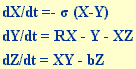 Im Gegensatz zur logistischen Abbildung und zur Hénon-Abbildung beschreiben die Lorenzgleichungen ein zeitkontinuierliches System. Edward N. Lorenz stellte diese dreidimensionale Differentialgleichung als näherungsweise gültiges Modell zur Beschreibung des Rayleigh-Benard-Experimentes (siehe dort die Bedeutung der Parameter) auf [Lorenz63].
